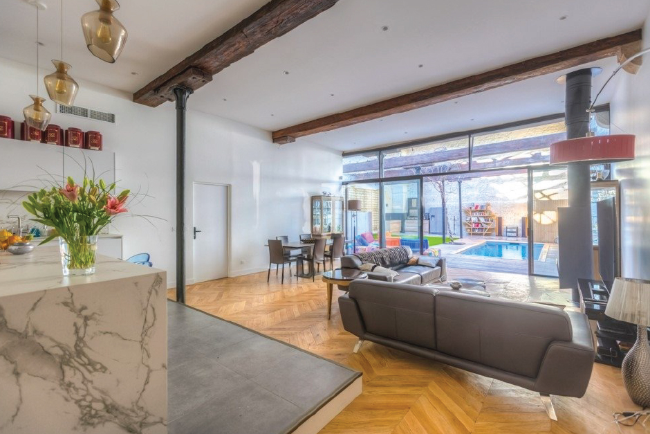 Conception Architecturale : Un mélange harmonieux d'éléments modernes et rustiques, avec de grandes baies vitrées, de la pierre naturelle et du bois récupéré.