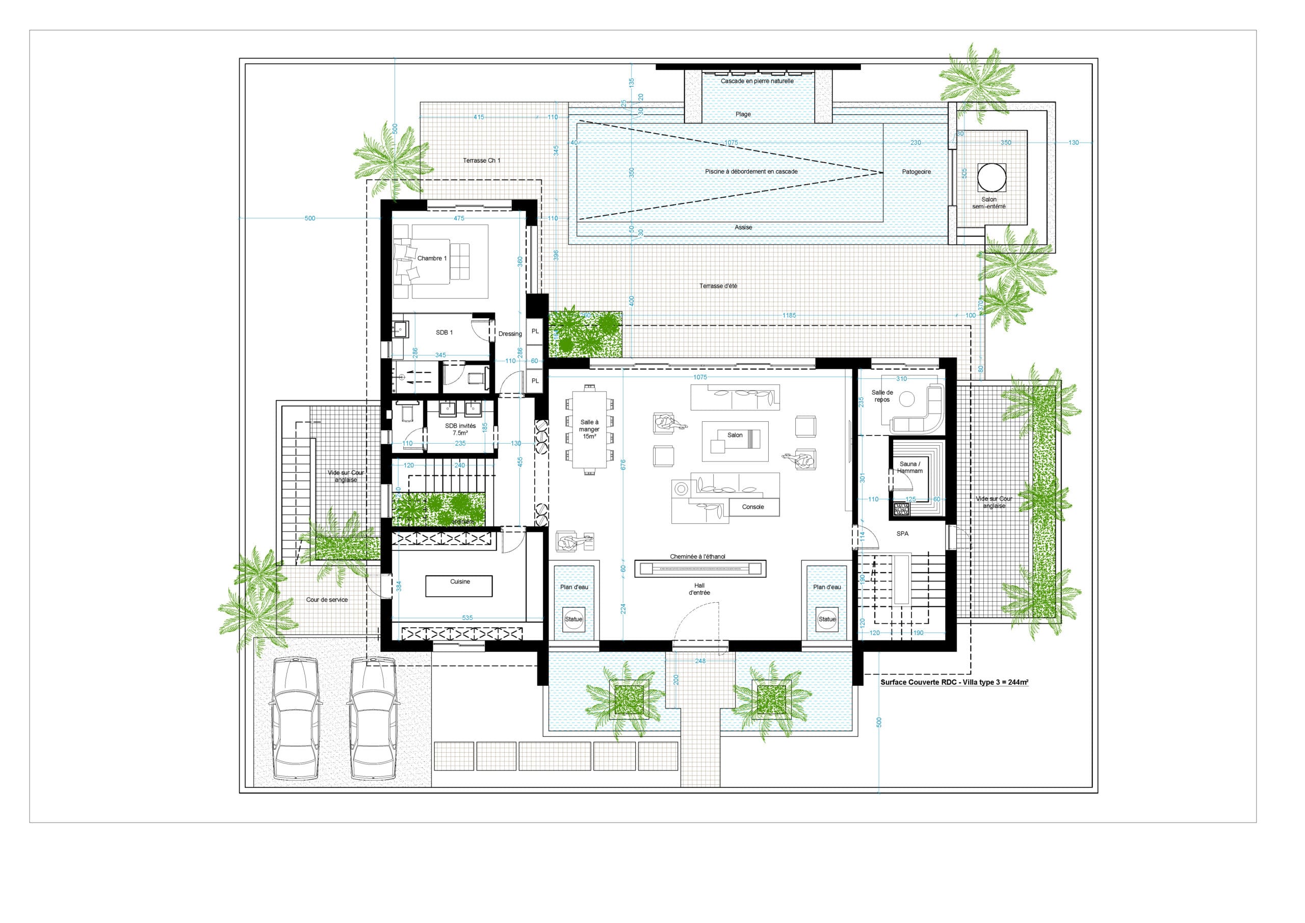 The villa boasts five en-suite bedrooms, including two spacious master suites, ensuring absolute comfort. A private spa and hammam on the ground floor provide a true haven of well-being, while the outdoor sala with a fire pit and private pool create the perfect setting for relaxation.